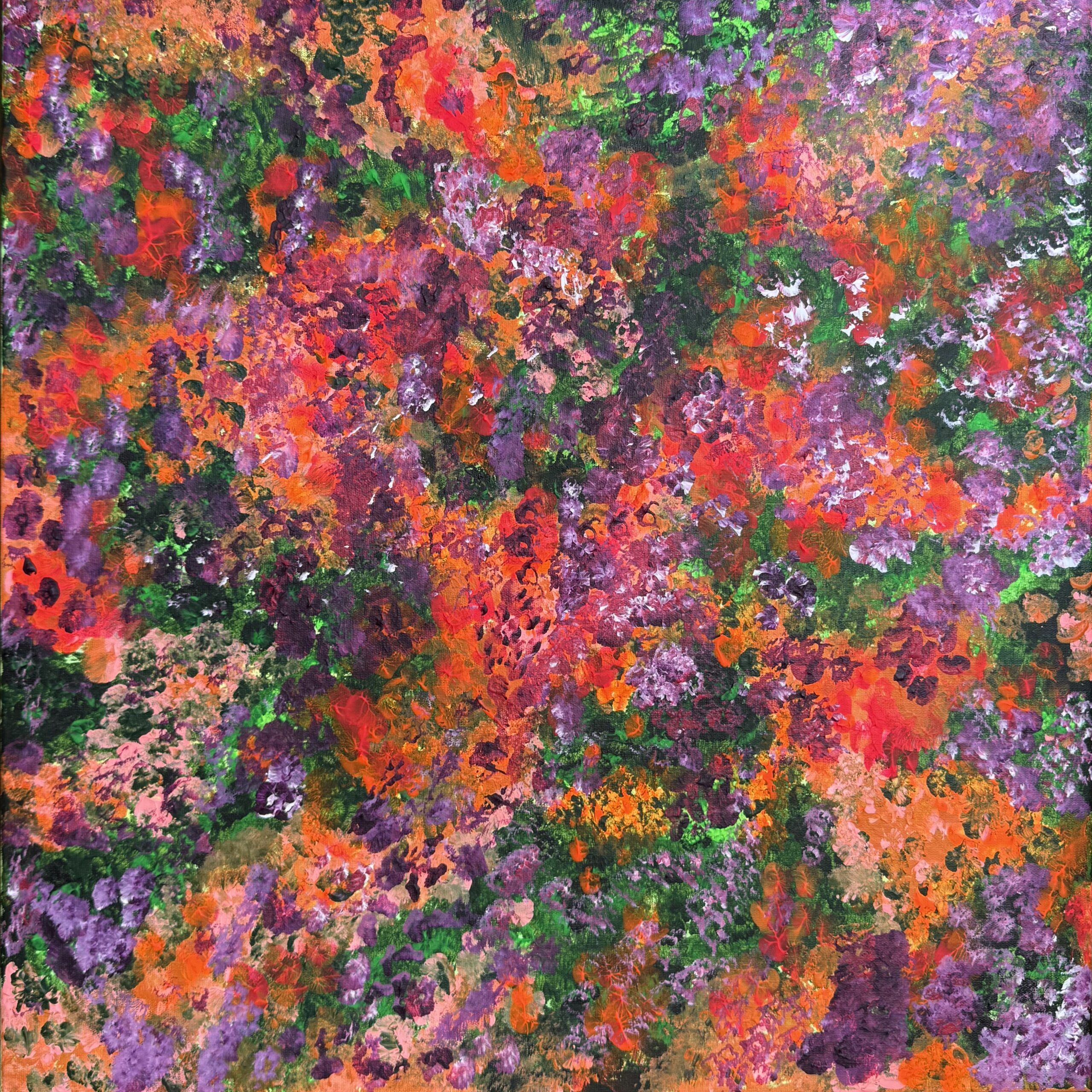 Nascida em estado de entrega, esta obra traduz a intensidade do desejo que move e consome. Cada pincelada carrega força, vulnerabilidade e potência criadora. Como um jardim secreto, a tela se abre em cores e gestos que desvelam trilhas ocultas — o mistério do querer, a chama do encontro, o fascínio do que ainda não se possui. Desejo aqui não é ausência, mas impulso vital: o movimento que faz corpo e alma arderem em busca de expansão.