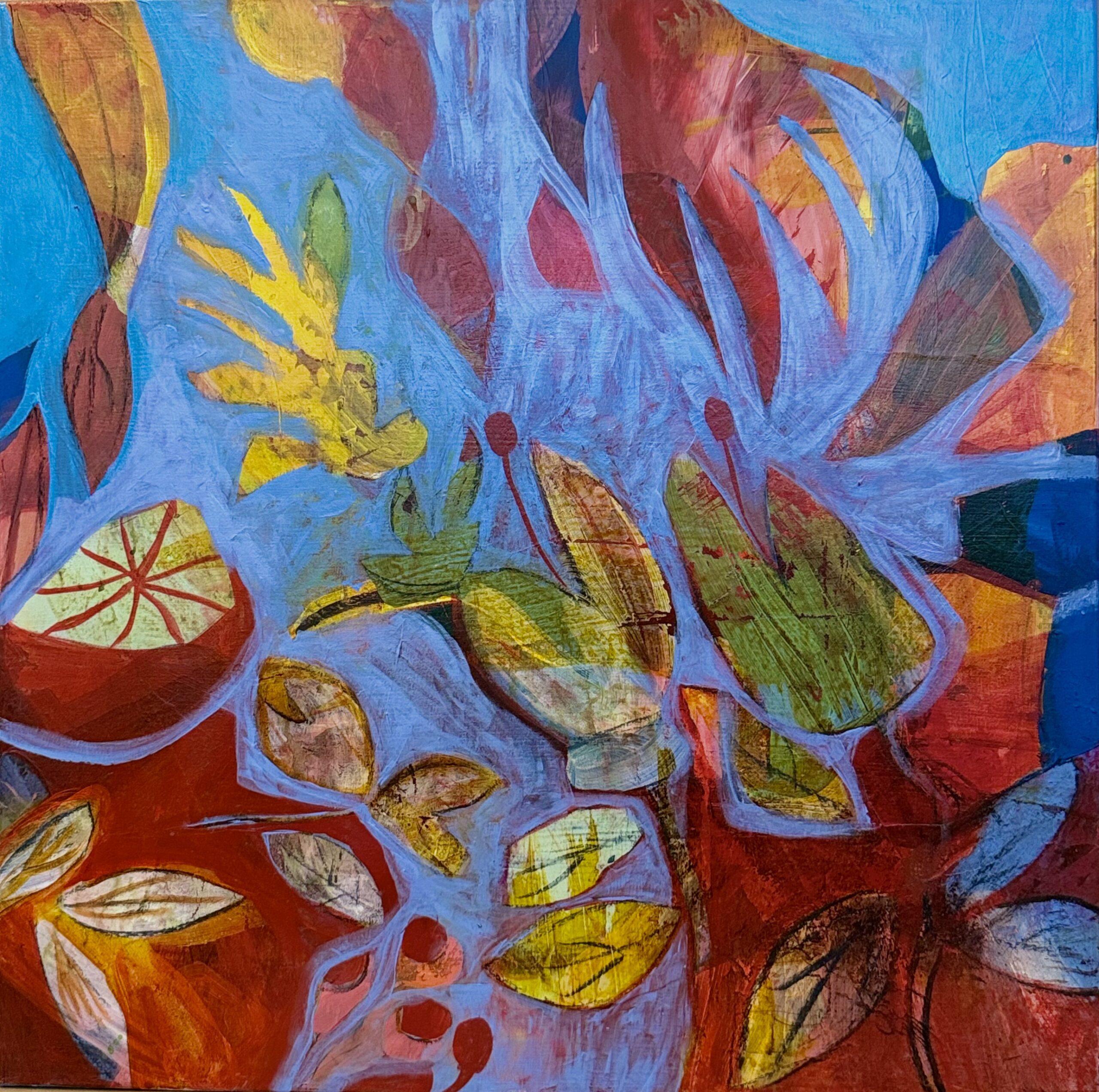 A obra é um mosaico fragmentado onde o azul funciona tanto como um céu intenso quanto como um vazio profundo onde tudo flutua. Os elementos distanciam de seus contextos originais e são reorganizados de forma lúdica e imprevisível.