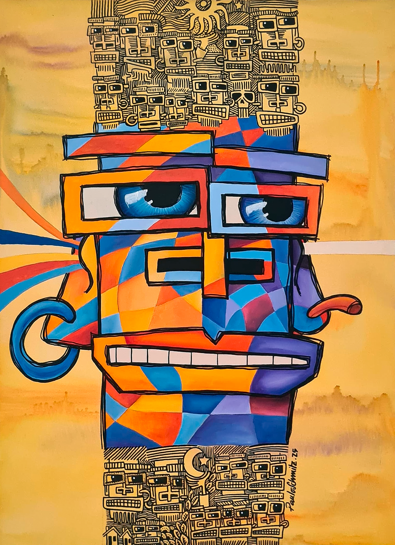 Esta tela representa a multiplicidade de informações que recebemos diariamente, somadas às questões internas que carregamos — pensamentos, crenças, sonhos e projetos que nos tornam plurais. As diferentes cores e fragmentos simbolizam esse fluxo constante de influências, que se misturam à nossa essência e são transformadas ao longo do tempo. O rosto expressa esse processo de construção contínua, moldado pelo crescimento, pela experiência e pelo amadurecimento. A obra propõe uma reflexão sobre essa complexidade: mesmo sendo compostos por inúmeras camadas, seguimos em busca de clareza — uma linha limpa que represente quem somos e o que realmente queremos.