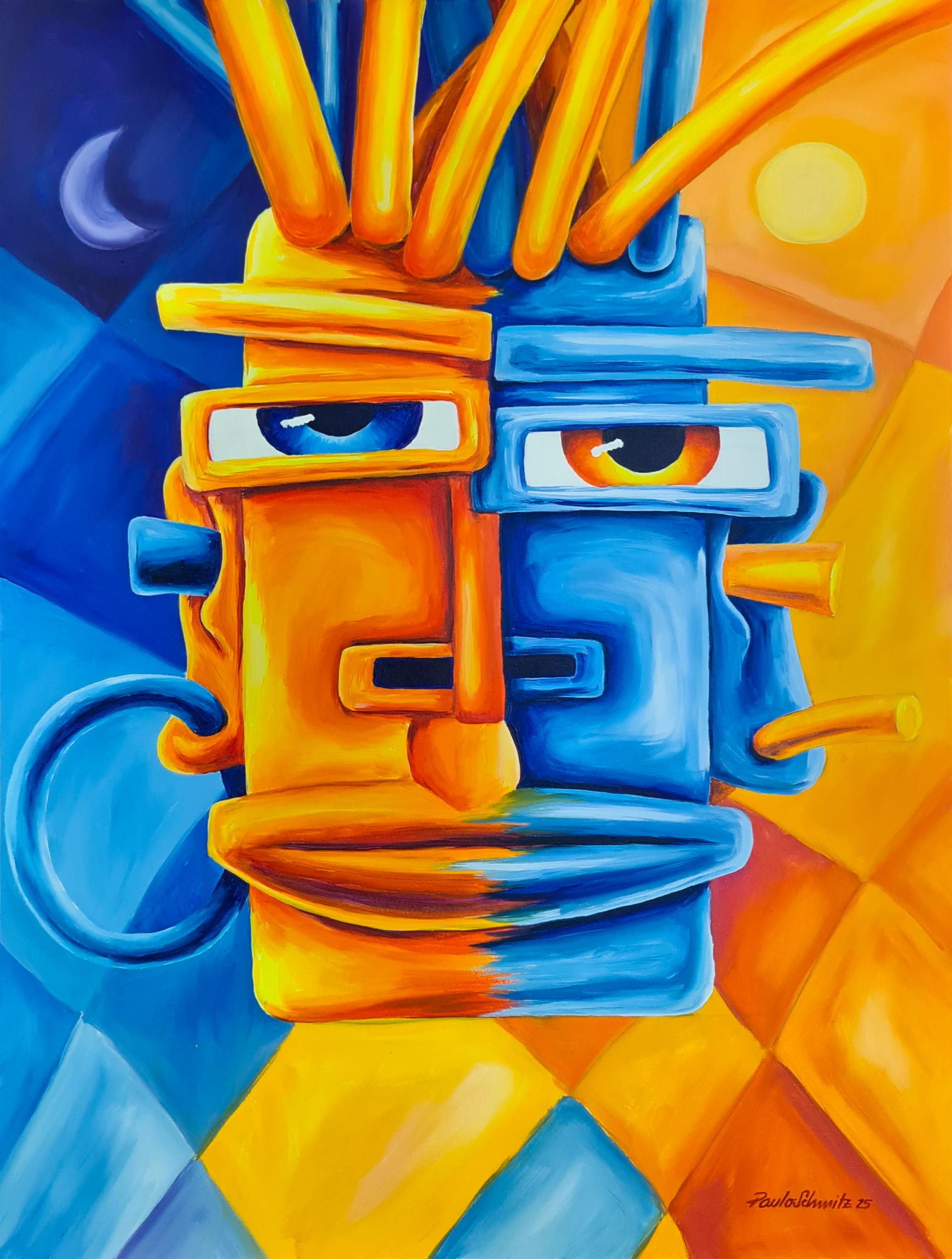 Nesta obra, a dualidade entre o calor e o frio, o dia e a noite, ganha forma em um rosto dividido que simboliza a harmonia necessária para uma vida plena. A composição traduz a ideia de que o equilíbrio é um fator vital para a felicidade — uma dança entre a energia solar que nos impulsiona e o descanso noturno que nos regenera. Os ouvidos tampados sugerem a necessidade de silenciar o ruído externo para ouvir a voz interior. A verdadeira conexão, aqui, não é com o mundo digital, mas com a alma. A figura se torna um símbolo de reconexão com o nosso eu mais profundo, num convite à expansão do pensamento e da consciência.