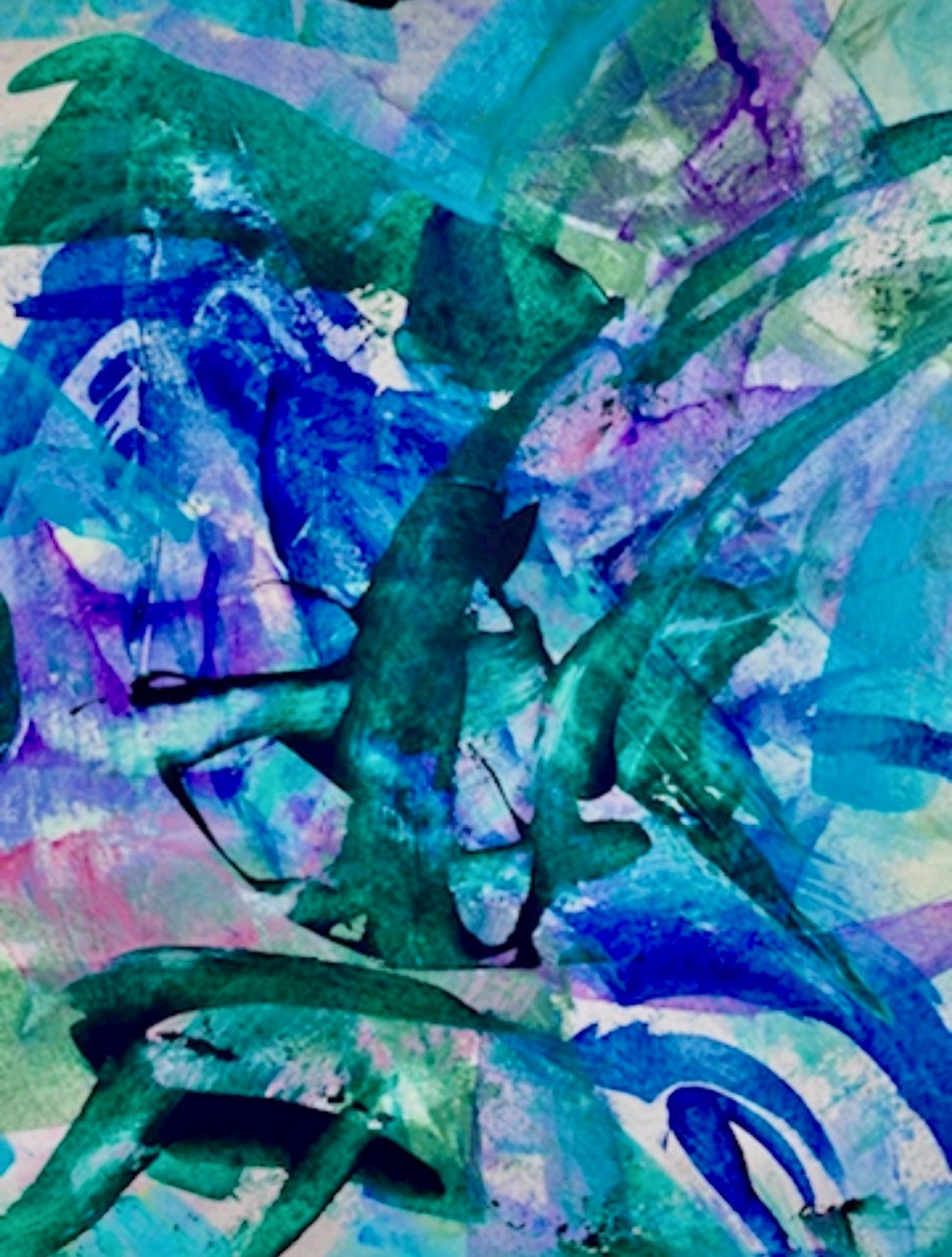 Na obra, pétalas parecem se abrir e se dissolver ao mesmo tempo, formadas por pinceladas leves e difusas, como se estivessem sendo vistas através da água ou da memória que evoca o Jardim de Majorelle.